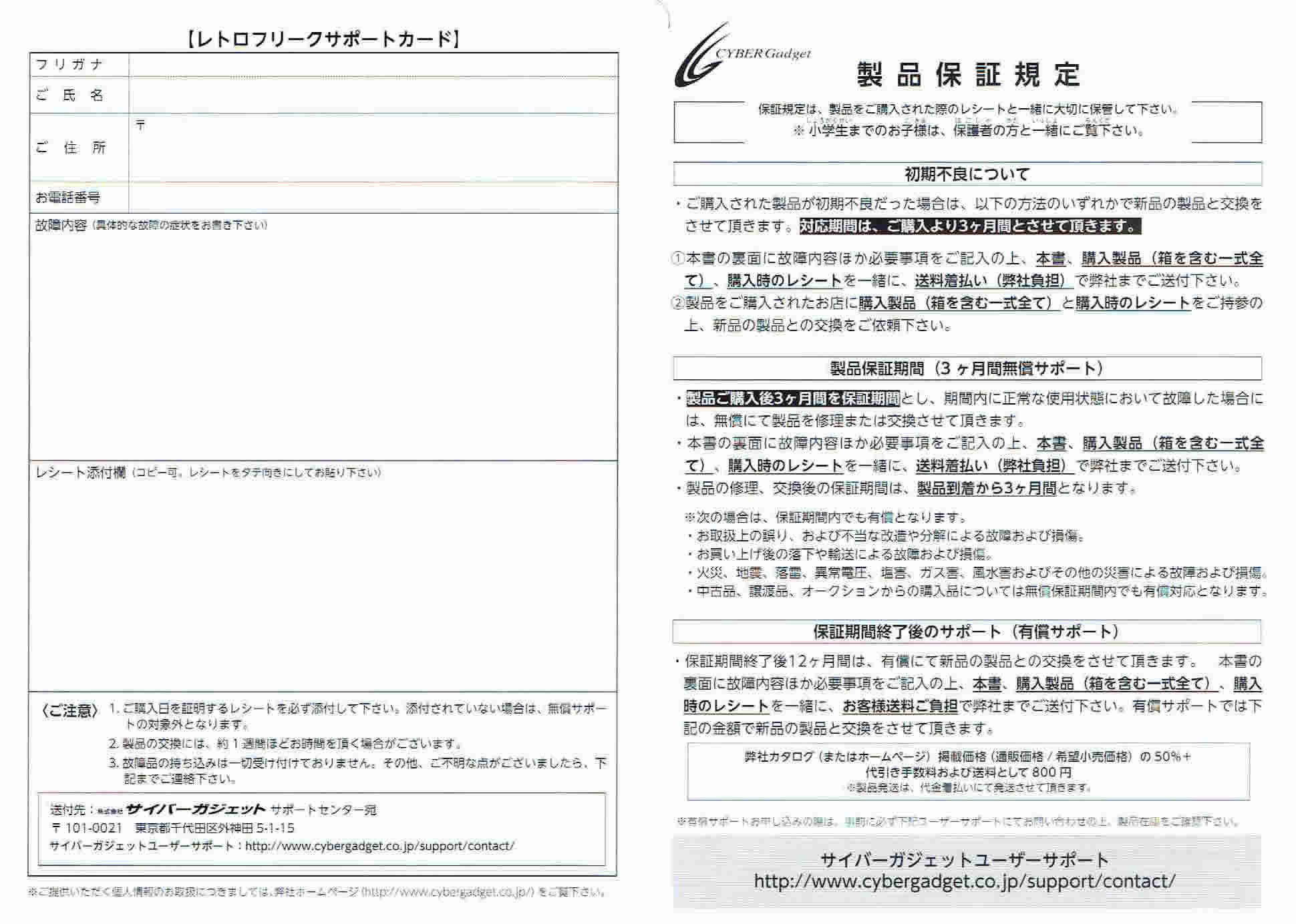 レトロフリーク 故障に関しまして2019年6月15日サイバーガジェット社製の多機能ゲーム互換機ですが、故障の多い製品として知られております。そのため、保証期間3ヶ月内に故障することも、その後故障することも多発している状況で、本体価格が高いために、当店にも多くの不満が寄せられております。サイバーガジェット社にてサポートをスムーズに行っていただけるよう、「レトロフリークサポートカード」の写しを掲載させていただきます。なお、掲載の期間は諸事情により終了させて頂く場合がございますことご了承ください。 2019年6月15日トラブル解決サポートカード,レトロフリーク,故障